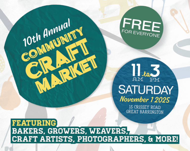 ¡Empieza tus compras de la temporada en nuestro Mercado Comunitario de Artesanía anual! Encuentra productos hechos a mano y artesanos, regalos únicos, delicias horneadas y conservas ofrecidas por artistas y pequeñas empresas de los Berkshires. El acto de este año se celebrará dentro de nuestro gimnasio y en nuestro aparcamiento lateral. ¡Todas las edades son bienvenidas!